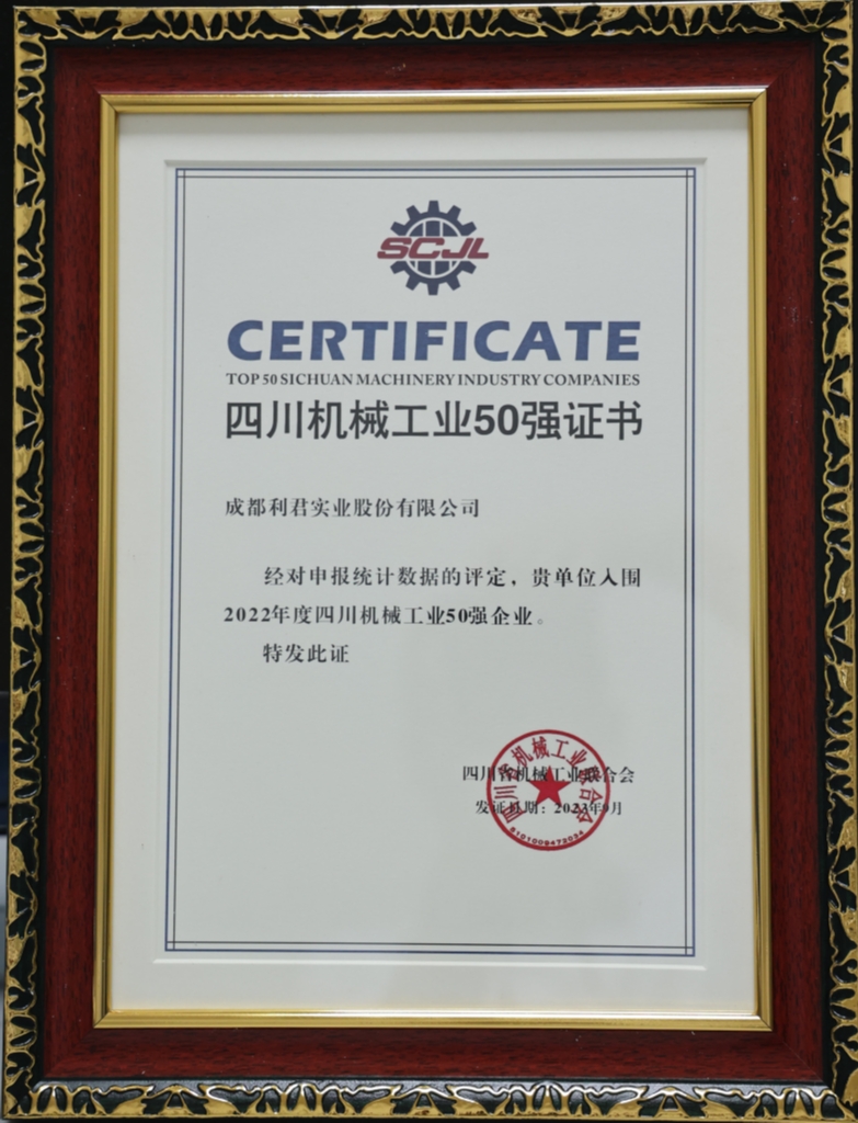 四川機(jī)械工業(yè)50強(qiáng)企業(yè)評(píng)選活動(dòng)由四川省機(jī)械工業(yè)聯(lián)合會(huì)主辦,在省經(jīng)信廳、各市州經(jīng)信局及相關(guān)行業(yè)協(xié)會(huì)的大力支持下,從2020年開始兩年評(píng)定一次,旨在宣傳推廣四川機(jī)械制造行業(yè)企業(yè),增強(qiáng)“四川造”品牌和社會(huì)影響力,推動(dòng)省內(nèi)各類企業(yè)做優(yōu)做強(qiáng)。本次評(píng)選按照“企業(yè)規(guī)?!?、“價(jià)值效益”、“創(chuàng)新轉(zhuǎn)型”、“高質(zhì)量發(fā)展”四項(xiàng)指標(biāo)進(jìn)行綜合評(píng)定,成都利君憑借優(yōu)秀的質(zhì)量效益、強(qiáng)大的自主創(chuàng)新能力、深厚的發(fā)展?jié)摿A得專家評(píng)委一致認(rèn)可,斬獲其殊榮。